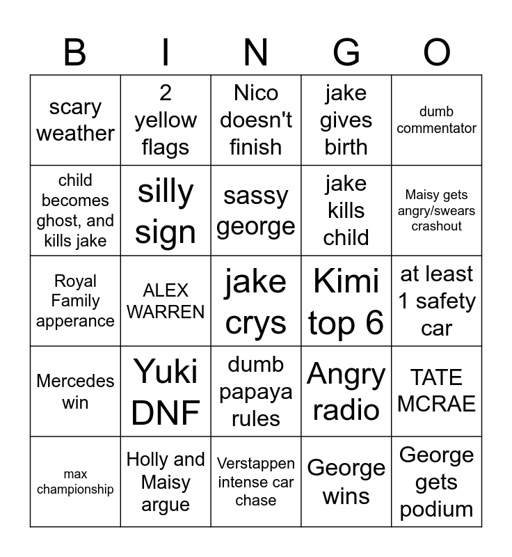 This bingo card has 34 words: George gets podium, George wins, Landon crashes, Oscar wins, Mercedes win, silly sign, dumb commentator, max championship, 2 yellow flags, animal/person on track, sassy george, Nico doesn't finish, Brazil, Gabbi top 18, Kimi top 6, Maisy gets angry/swears crashout, Holly and Maisy argue, Royal Family apperance, Yuki DNF, Angry radio, dumb papaya rules, chaotic sprint, scary weather, at least 1 safety car, Verstappen intense car chase, jake crys, jake gives birth, jake has bby girl, jake kills child, child becomes ghost, and kills jake, OLIVIA RODRIGO, ALEX WARREN, TATE MCRAE and SABRINA CARPENTER.