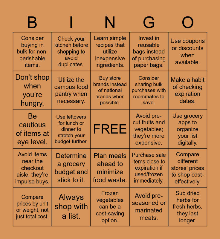 This bingo card has a free space and 24 words: Determine a grocery budget and stick to it., Always shop with a list., Buy store brands instead of national brands when possible., Compare prices by unit or weight, not just total cost., Use coupons or discounts when available., Consider buying in bulk for non-perishable items., Don’t shop when you’re hungry., Check your kitchen before shopping to avoid duplicates., Avoid pre-cut fruits and vegetables; they’re more expensive., Plan meals ahead to minimize food waste., Consider sharing bulk purchases with roommates to save., Be cautious of items at eye level., Purchase sale items close to expiration if used/frozen immediately., Compare different stores’ prices to shop cost-effectively., Utilize the campus food pantry when necessary., Avoid pre-seasoned or marinated meats., Use grocery apps to organize your list digitally., Learn simple recipes that utilize inexpensive ingredients., Make a habit of checking expiration dates., Use leftovers for lunch or dinner to stretch your budget further., Sub dried herbs for fresh herbs, they last longer., Avoid items near the checkout aisle, they’re impulse buys., Invest in reusable bags instead of purchasing paper bags. and Frozen vegetables can be a cost-saving option..