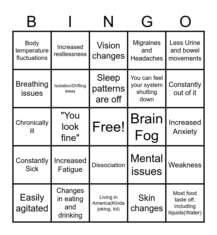 This bingo card has a free space and 24 words: Increased Fatigue, Changes in eating and drinking, Sleep patterns are off, Easily agitated, Less Urine and bowel movements, Body temperature fluctuations, Breathing issues, Increased restlessness, Brain Fog, Dissociation, You can feel your system shutting down, Chronically ill, Mental issues, Weakness, Isolation/Drifting away, Skin changes, Increased Anxiety, Vision changes, Constantly out of it, "You look fine", Most food taste off, including liquids(Water), Constantly Sick, Migraines and Headaches and Living in America(Kinda joking, lol).