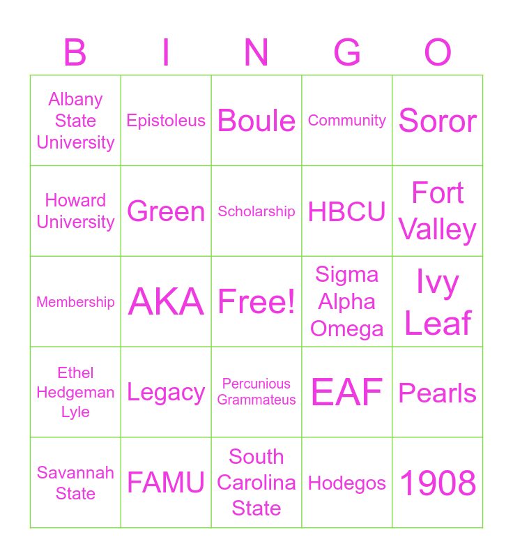 This bingo card has a free space and 38 words: Sisterhood, Service, Pink, Green, Pearls, Legacy, Scholarship, Leadership, Soror, HBCU, AKA, Community, 1908, Ivy Leaf, Howard University, Ethel Hedgeman Lyle, Service to All Mankind, Boule, South Atlantic, Sigma Alpha Omega, Albany State University, FAMU, Fort Valley, Savannah State, Spelman, South Carolina State, Basileus, 1st Anti Basileus, 2nd Anti Basileus, Grammateus, Tamiouchos, Percunious Grammateus, Hodegos, Epistoleus, Philacter, EAF, Membership and Sisterly Relations.