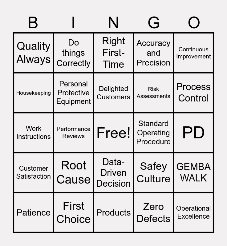 This bingo card has a free space and 31 words: Products, Processes, Performance Reviews, Safety First, Quality Always, Right First-Time, Personal Protective Equipment, Safey Culture, Standard Operating Procedure, Zero Defects, PD, Operational Excellence, Equipment Maintenance, P.A.S.S., Process Control, Training, GEMBA WALK, Root Cause, Customer Satisfaction, Data-Driven Decision, Continuous Improvement, Performance Dialog, Patience, Do things Correctly, Risk Assessments, Housekeeping, Accuracy and Precision, Work Instructions, First Choice, Delighted Customers and S.L.A.M.