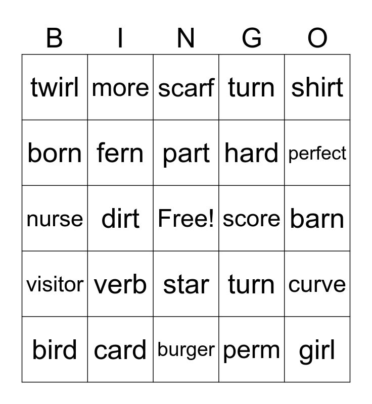 This bingo card has a free space and 24 words: verb, card, part, bird, shirt, twirl, born, more, score, star, hard, nurse, turn, curve, fern, perm, barn, scarf, perfect, dirt, girl, visitor, turn and burger.