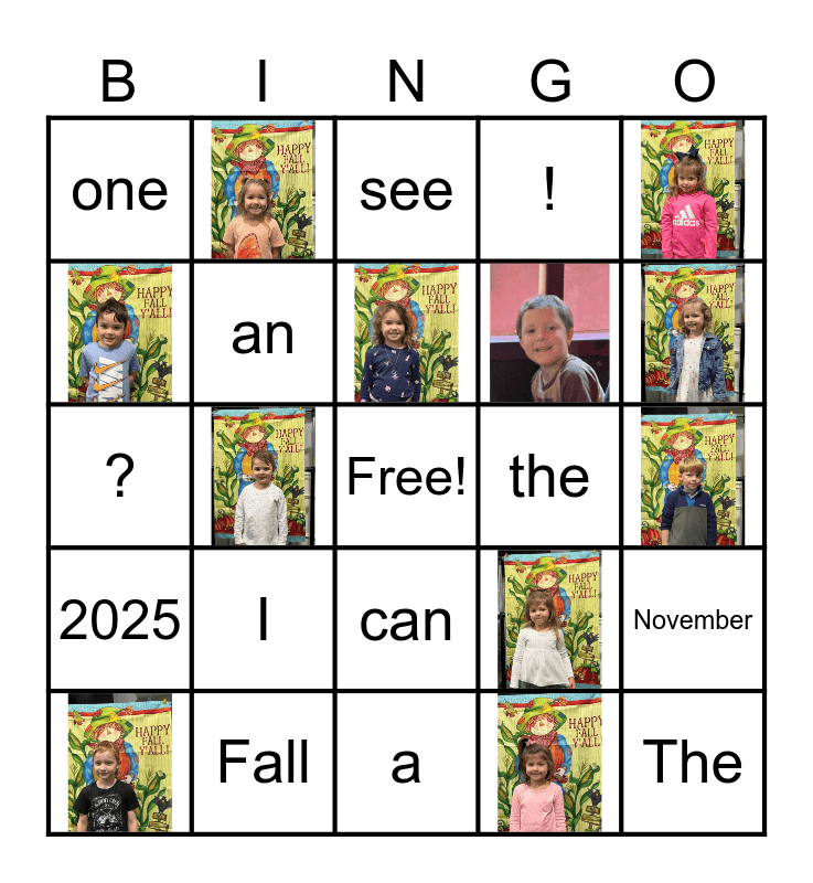 This bingo card has 11 images, a free space and 13 words: I, Fall, one, the, can, ?, November, an, see, The, 2025, ! and a.
