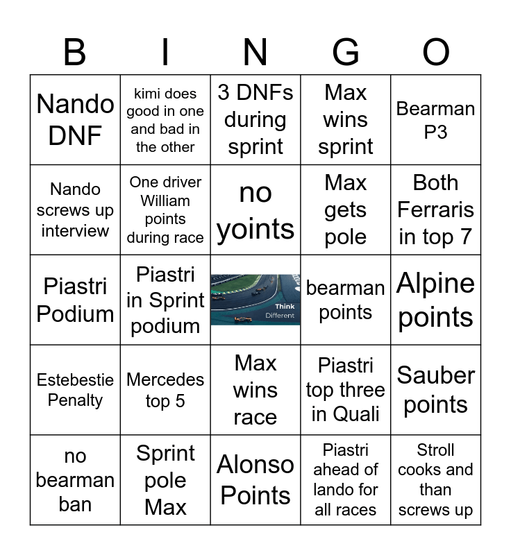 This bingo card has a free space and 24 words: Mercedes top 5, Sprint pole Max, no yoints, no bearman ban, Bearman P3, Nando DNF, Nando screws up interview, kimi does good in one and bad in the other, bearman points, Max wins race, Max gets pole, Piastri Podium, Piastri top three in Quali, Sauber points, One driver William points during race, Piastri ahead of lando for all races, Alpine points, 3 DNFs during sprint, Both Ferraris in top 7, Piastri in Sprint podium, Stroll cooks and than screws up, Estebestie Penalty, Max wins sprint and Alonso Points.