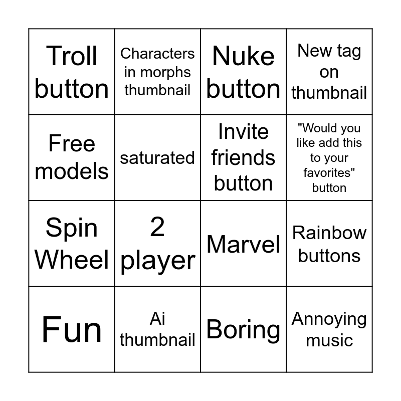 This bingo card has 16 words: Ai thumbnail, Rainbow buttons, Nuke button, Troll button, Spin Wheel, Characters in morphs thumbnail, Marvel, Boring, Free models, saturated, Fun, New tag on thumbnail, 2 player, "Would you like add this to your favorites" button, Invite friends button and Annoying music.
