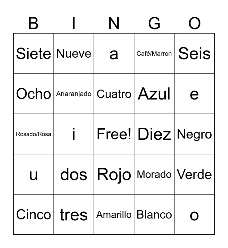 This bingo card has a free space and 24 words: dos, tres, Cuatro, Cinco, Seis, Siete, Ocho, Nueve, Diez, Rojo, Azul, Rosado/Rosa, Morado, Verde, Anaranjado, Blanco, Negro, a, e, i, o, u, Café/Marron and Amarillo.