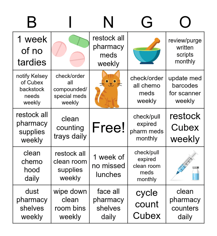 This bingo card has 5 images, a free space and 24 words: dust pharmacy shelves weekly, send pickup reminders weekly, clean counting trays daily, clean room monthly deep-clean, 1 week of no tardies, restock all pharmacy meds weekly, check/order all compounded/ special meds weekly, restock all clean room supplies weekly, check/pull expired pharm meds monthly, wipe down clean room bins weekly, restock Cubex weekly, clean pharmacy counters daily, face all pharmacy shelves daily, cycle count Cubex, update med barcodes for scanner weekly, restock all clean room meds weekly, 1 week of no missed lunches, clean chemo hood daily, review/purge written scripts monthly, restock all pharmacy supplies weekly, check/pull expired clean room meds monthly, delete invoices and restock meds not picked up weekly, check/order all chemo meds weekly and notify Kelsey of Cubex backstock needs weekly.