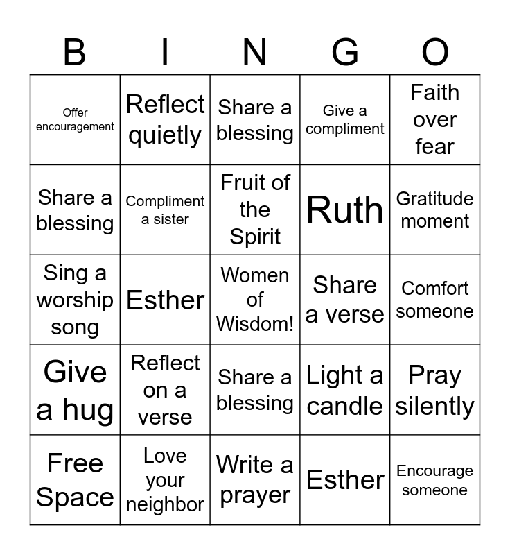 This bingo card has a free space and 245 words: Psalm 23, Pray for a friend, Free Space, Joseph, Share a blessing, Light a candle, Fruit of the Spirit, Hug a friend, Reflect quietly, Proverbs 31, Ruth, Testimony share, Smile at someone, Offer kindness, Sing a song, Faith over fear, Bible story, Encourage someone, Give a compliment, Gratitude moment, Share a verse, Comfort someone, Joyful heart, Serve someone, Love your neighbor, Offer prayer, Ruth, Sing a worship song, Hug a friend, Share a blessing, Light a candle, Smile at someone, Psalm 91, Joseph, Reflect quietly, Faith over fear, Proverbs 31, Encourage someone, Testimony share, Comfort someone, Share a verse, Bible story, Gratitude moment, Joyful heart, Pray for a sister, Give a compliment, Love your neighbor, Serve someone, Share wisdom, Share a testimony, Light a candle, Fruit of the Spirit, Hug a friend, Ruth, Offer kindness, Proverbs 31, Reflect quietly, Psalm 23, Joseph, Smile at someone, Share a blessing, Faith over fear, Give a compliment, Testimony share, Bible story, Sing a song, Encourage someone, Gratitude moment, Love your neighbor, Joyful heart, Pray for a sister, Share wisdom, Pray silently, Comfort someone, Proverbs 3:5, Share a verse, Offer prayer, Psalm 91, Light a candle, Pray for a friend, Ruth, Give a hug, Share a blessing, Faith over fear, Joseph, Testimony share, Smile at someone, Gratitude moment, Bible story, Encourage someone, Sing a song, Serve someone, Hug a friend, Fruit of the Spirit, Reflect quietly, Joyful heart, Share wisdom, Psalm 23, Free Space, Pray silently, Ruth, Faithful friend, Light a candle, Share a testimony, Hug a friend, Offer kindness, Song of Praise, Gratitude note, Proverbs 31, Encourage someone, Bible story, Share a blessing, Smile at someone, Joseph, Give a compliment, Reflect quietly, Testimony share, Love your neighbor, Fruit of the Spirit, Faith over fear, Pray for a sister, Sing a worship song, Share a verse, Offer prayer, Esther, Joyful heart, Hug a friend, Faith over fear, Psalm 91, Pray for a friend, Light a candle, Bible story, Gratitude moment, Share a blessing, Ruth, Sing a song, Testimony share, Smile at someone, Proverbs 3:5, Comfort someone, Encourage someone, Joseph, Reflect quietly, Love your neighbor, Give a compliment, Fruit of the Spirit, Proverbs 31, Pray for a sister, Free Space, Share a testimony, Psalm 23, Light a candle, Ruth, Offer encouragement, Gratitude note, Sing a song, Hug a friend, Joseph, Reflect on a verse, Give a compliment, Fruit of the Spirit, Bible story, Serve someone, Smile at someone, Pray silently, Share wisdom, Faith over fear, Testimony share, Share a blessing, Offer kindness, Love your neighbor, Prayer journal, David & Goliath, Sing a worship song, Share a verse, Offer kindness, Psalm 121, Ruth, Light a candle, Testimony share, Compliment a sister, Joseph, Pray silently, Proverbs 16:3, Thank God, Encourage someone, Smile at someone, Fruit of the Spirit, Bible story, Hug a friend, Share a blessing, Faith over fear, Esther, Gratitude moment, Love your neighbor, Faithful friend, Psalm 91, Pray silently, Free Space, Song of Praise, Share a testimony, Deborah, Give a compliment, Bible verse, Spread joy, Encourage someone, Ruth, Offer prayer, Love your neighbor, Gratitude note, Serve someone, Esther, Reflect quietly, Light a candle, Share wisdom, Smile at someone, Proverbs 3:5, Share a blessing, Hug a friend, Thank God, Pray for a friend, Proverbs 31, Share a blessing, Free Space, Psalm 23, Offer encouragement, Esther, Write a prayer, Give a hug, Faith over fear, Gratitude moment, Joseph’s coat, Ask for wisdom, Fruit of the Spirit, Thank God for family, Singing praise, Ruth, Light a candle, Bible story, Love your neighbor, Testimony share, Smile at someone, Share favorite scripture, Comfort someone and Forgive someone.