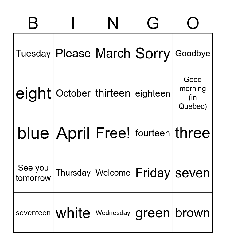 This bingo card has a free space and 26 words: Welcome, green, thirteen, white, Goodbye, Tuesday, eight, Please, three, Friday, eighteen, blue, seven, seventeen, April, four, Sorry, See you tomorrow, March, brown, Good morning (in Quebec), Wednesday, fourteen, Thursday, October and September.