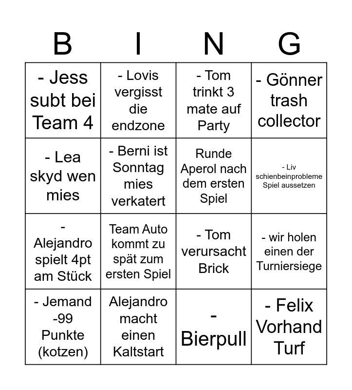 This bingo card has 26 words: - Oger punkt, - Jess ist unzufrieden wie wir spielen, - Liv schienbeinprobleme Spiel aussetzen, - Ich habe auf Franzi gestrichelt, - Lea skyd wen mies, - Jess subt bei Team 4, - Berni ist Sonntag mies verkatert, - Lovis vergisst die endzone, - Bierpull, - Leos signature, - Alejandro spielt 4pt am Stück, - Tom verursacht Brick, - Nik layout, - Kreislauf in Sauna weg, - wir holen einen der Turniersiege, - Jules scooberscore, - Gönner trash collector, - Felix Vorhand Turf, - Tom trinkt 3 mate auf Party, - Jemand -99 Punkte (kotzen), Team Auto kommt zu spät zum ersten Spiel, Callahan passiert, Alejandro macht einen Kaltstart, Felix wird von Feld gerufen weil er nicht von selbst gehen will, Runde Aperol nach dem ersten Spiel and Peinlicher Moment beim Essen.