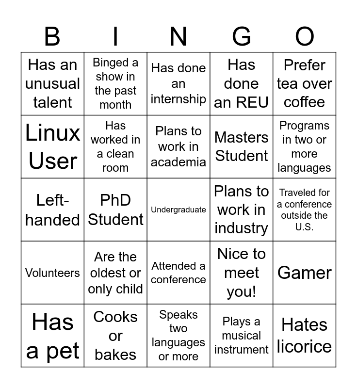 This bingo card has 25 words: Are the oldest or only child, Speaks two languages or more, Plans to work in academia, Has a pet, Prefer tea over coffee, Has an unusual talent, Linux User, Binged a show in the past month, Plans to work in industry, Attended a conference, Masters Student, Left-handed, Nice to meet you!, Gamer, Has worked in a clean room, Hates licorice, Traveled for a conference outside the U.S., Has done an internship, Programs in two or more languages, PhD Student, Undergraduate, Cooks or bakes, Volunteers, Has done an REU and Plays a musical instrument.