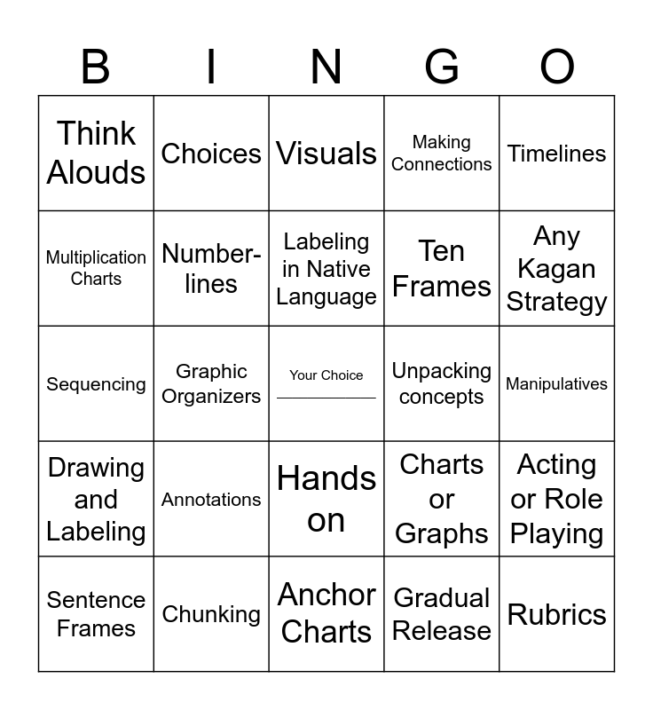 This bingo card has a free space and 29 words: Sentence Frames, Modeling, Graphic Organizers, Word Banks, Think Alouds, Visuals, Number-lines, Annotations, Unpacking concepts, Chunking, Manipulatives, Rubrics, Anchor Charts, Gradual Release, Any Kagan Strategy, Close Reading, Hands on, Drawing and Labeling, Timelines, Sequencing, Charts or Graphs, Making Predictions, Ten Frames, Multiplication Charts, Making Connections, Choices, Acting or Role Playing, Labeling in Native Language and Music or Songs.
