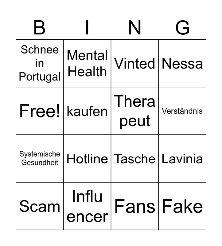 This bingo card has 16 words: Influ encer, Lavinia, Vinted, Schnee in Portugal, Systemische Gesundheit, Mental Health, Tasche, Fans, Free!, kaufen, Scam, Nessa, Hotline, Verständnis, Thera peut and Fake.