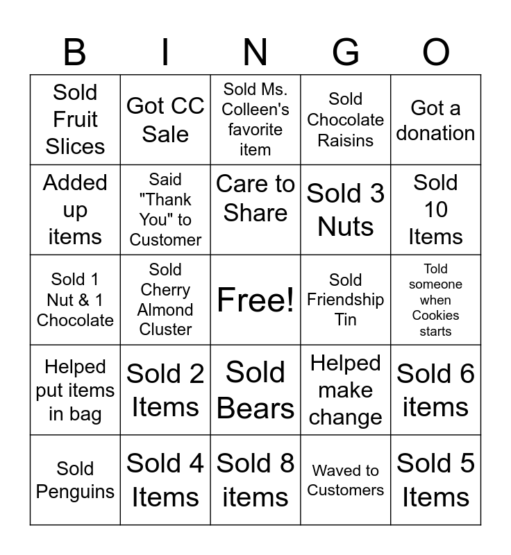 This bingo card has a free space and 24 words: Sold 2 Items, Sold 4 Items, Care to Share, Sold Penguins, Got a donation, Sold Fruit Slices, Added up items, Got CC Sale, Sold Friendship Tin, Sold Bears, Sold 3 Nuts, Sold 1 Nut & 1 Chocolate, Helped make change, Sold 6 items, Said "Thank You" to Customer, Waved to Customers, Told someone when Cookies starts, Sold Ms. Colleen's favorite item, Sold 10 Items, Sold Cherry Almond Cluster, Sold 5 Items, Helped put items in bag, Sold Chocolate Raisins and Sold 8 items.