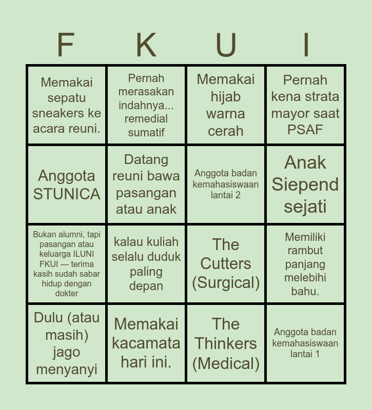 This bingo card has 16 words: Memakai kacamata hari ini., Memiliki rambut panjang melebihi bahu., Memakai hijab warna cerah, Memakai sepatu sneakers ke acara reuni., Bukan alumni, tapi pasangan atau keluarga ILUNI FKUI — terima kasih sudah sabar hidup dengan dokter, Pernah merasakan indahnya... remedial sumatif, The Cutters (Surgical), The Thinkers (Medical), Anggota STUNICA, Datang reuni bawa pasangan atau anak, Dulu (atau masih) jago menyanyi, Pernah kena strata mayor saat PSAF, kalau kuliah selalu duduk paling depan, Anak Siepend sejati, Anggota badan kemahasiswaan lantai 2 and Anggota badan kemahasiswaan lantai 1.