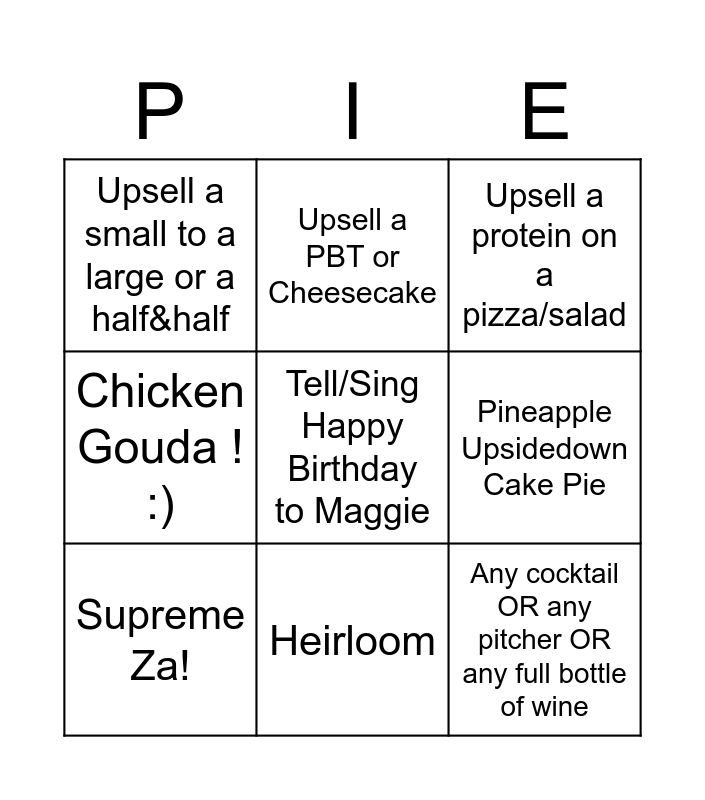 This bingo card has a free space and 8 words: Pineapple Upsidedown Cake Pie, Upsell a protein on a pizza/salad, Upsell a PBT or Cheesecake, Supreme Za!, Upsell a small to a large or a half&half, Any cocktail OR any pitcher OR any full bottle of wine, Chicken Gouda ! :) and Heirloom.
