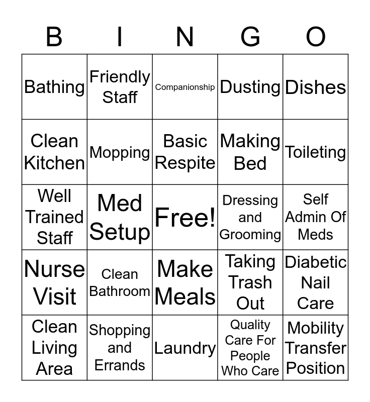 This bingo card has a free space and 24 words: Clean Bathroom, Shopping and Errands, Basic Respite, Clean Living Area, Dishes, Bathing, Clean Kitchen, Friendly Staff, Dressing and Grooming, Make Meals, Making Bed, Well Trained Staff, Taking Trash Out, Diabetic Nail Care, Mopping, Quality Care For People Who Care, Self Admin Of Meds, Companionship, Toileting, Med Setup, Mobility Transfer Position, Nurse Visit, Dusting and Laundry.