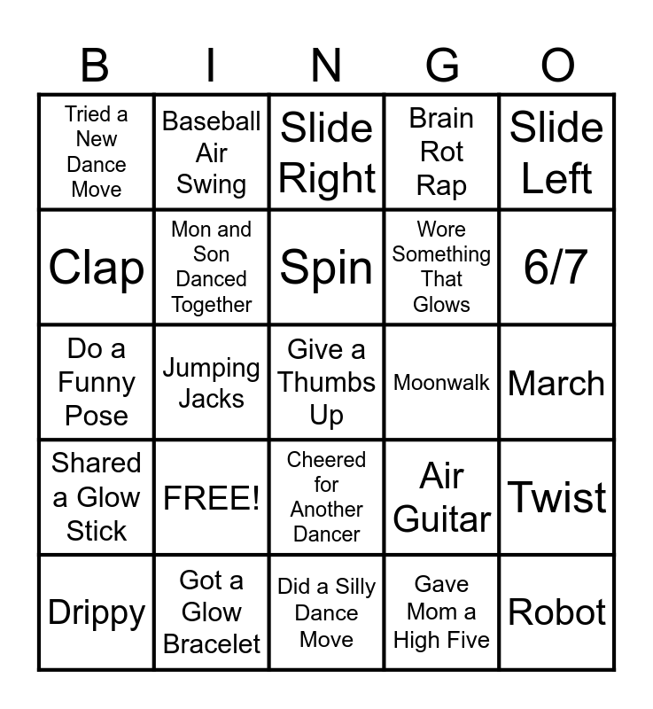 This bingo card has 25 words: FREE!, Did a Silly Dance Move, Spin, Drippy, Slide Left, Tried a New Dance Move, Clap, Baseball Air Swing, Moonwalk, Cheered for Another Dancer, Wore Something That Glows, Do a Funny Pose, Air Guitar, Twist, Mon and Son Danced Together, Robot, March, Slide Right, 6/7, Jumping Jacks, Give a Thumbs Up, Got a Glow Bracelet, Shared a Glow Stick, Brain Rot Rap and Gave Mom a High Five.