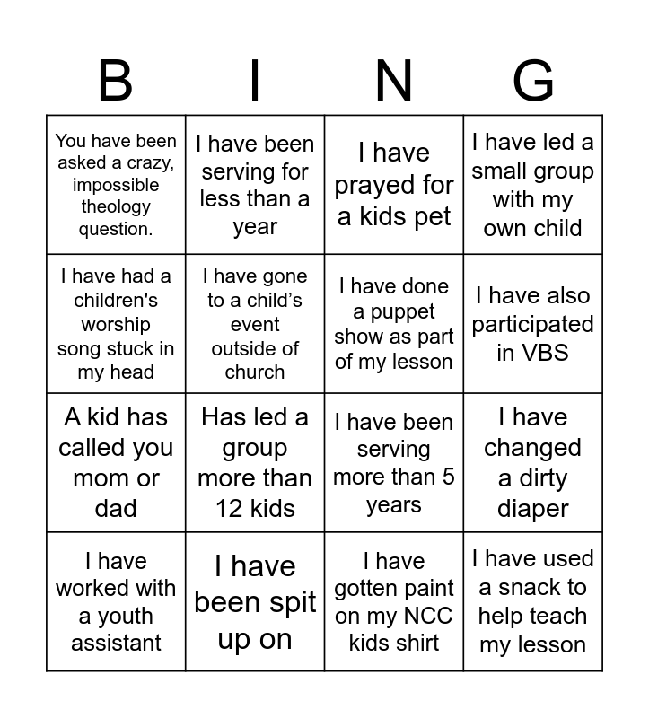 This bingo card has 16 words: I have been spit up on, I have changed a dirty diaper, I have prayed for a kids pet, You have been asked a crazy, impossible theology question., A kid has called you mom or dad, I have been serving for less than a year, I have been serving more than 5 years, I have gotten paint on my NCC kids shirt, I have had a children's worship song stuck in my head, I have gone to a child’s event outside of church, I have worked with a youth assistant, I have led a small group with my own child, Has led a group more than 12 kids, I have also participated in VBS, I have done a puppet show as part of my lesson and I have used a snack to help teach my lesson.
