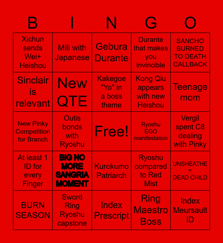 This bingo card has a free space and 24 words: BIG NO MORE SANGRIA MOMENT, Sword Ring Ryoshu capstone, Kakegoe "Yo" in a boss theme, BURN SEASON, SANCHO BURNED TO DEATH CALLBACK, Xichun sends Wei+ Heishou, Sinclair is relevant, Mili with Japanese, Ryoshu EGO manifestation, Kurokumo Patriarch, Kong Qiu appears with new Heishou, New Pinky Competition for Branch, Ryoshu compared to Red Mist, UNSHEATHE = DEAD CHILD, New QTE, Ring Maestro Boss, Vergil spent C8 dealing with Pinky, Gebura Durante, Teenage mom, Outis bonds with Ryoshu, Index Meursault ID, At least 1 ID for every Finger, Durante that makes you invincible and Index Prescript.