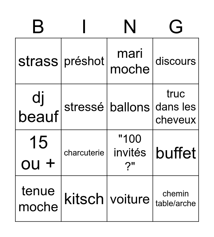 This bingo card has 16 words: kitsch, buffet, mari moche, strass, 15 ou +, préshot, "100 invités ?", voiture, dj beauf, stressé, tenue moche, discours, charcuterie, truc dans les cheveux, ballons and chemin table/arche.