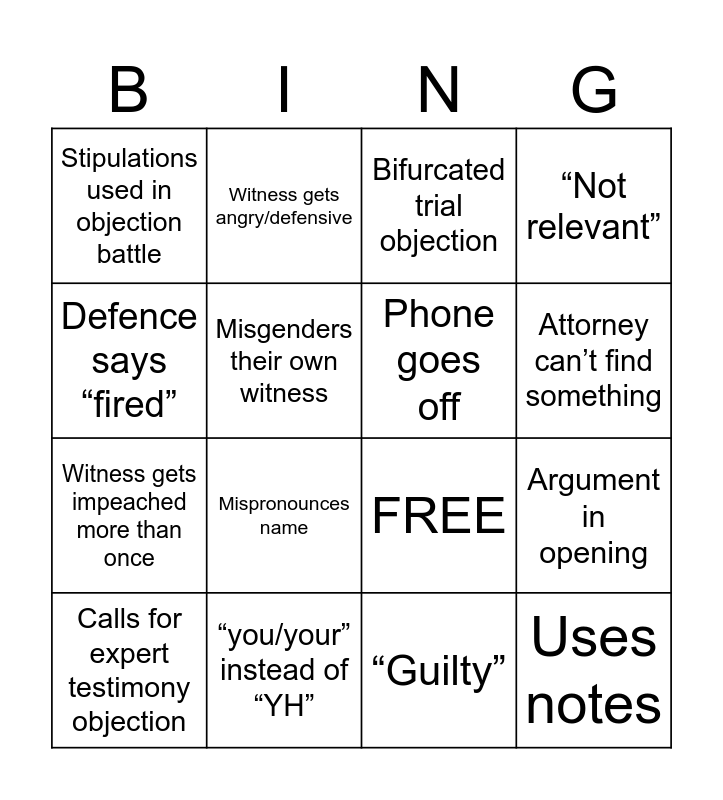 This bingo card has 16 words: “you/your” instead of “YH”, Argument in opening, Bifurcated trial objection, Stipulations used in objection battle, Witness gets impeached more than once, Witness gets angry/defensive, FREE, “Guilty”, Defence says “fired”, Misgenders their own witness, Calls for expert testimony objection, “Not relevant”, Mispronounces name, Attorney can’t find something, Phone goes off and Uses notes.