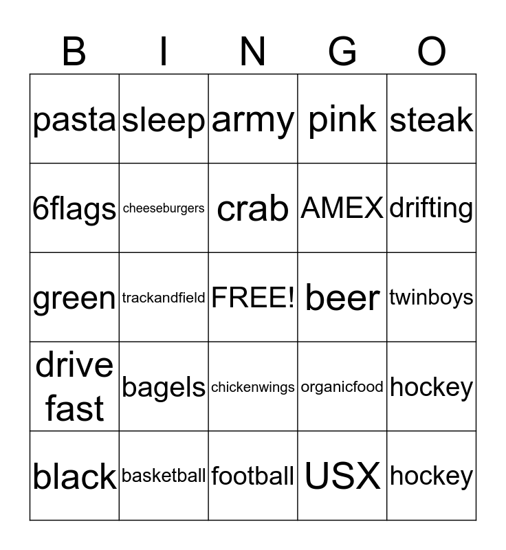 This bingo card has a free space and 28 words: hockey, shop, AMEX, USX, 6flags, army, sleep, drive fast, beer, black, green, pink, basketball, football, drifting, hiking, bagels, cheeseburgers, crab, chickenwings, pasta, shrimp, hockey, trackandfield, twinboys, organicfood, steak and amish.
