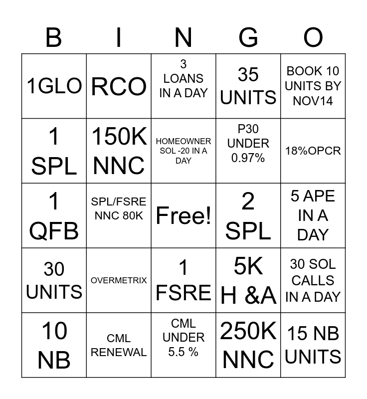 This bingo card has a free space and 24 words: 10 NB, OVERMETRIX, HOMEOWNER SOL -20 IN A DAY, 250K NNC, BOOK 10 UNITS BY NOV14, 1GLO, RCO, 3 LOANS IN A DAY, 2 SPL, 5 APE IN A DAY, 1 QFB, 150K NNC, 5K H &A, 30 SOL CALLS IN A DAY, 1 SPL, CML RENEWAL, CML UNDER 5.5 %, 35 UNITS, 18%OPCR, 30 UNITS, SPL/FSRE NNC 80K, 1 FSRE, P30 UNDER 0.97% and 15 NB UNITS.