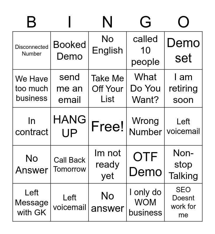 This bingo card has a free space and 29 words: Let me Think about it, Left voicemail, No English, Call Back in X Months, Demo set, Disconnected Number, send me an email, Take Me Off Your List, Wrong Number, Non-stop Talking, Left Message with GK, HANG UP, I only do WOM business, SEO Doesnt work for me, In contract, Not Interested, No answer, OTF Demo, I am retiring soon, No Answer, Call Back Tomorrow, Cursed out, What Do You Want?, Left voicemail, We Have too much business, Booked Demo, Im not ready yet, called 10 people and Left voicemail.