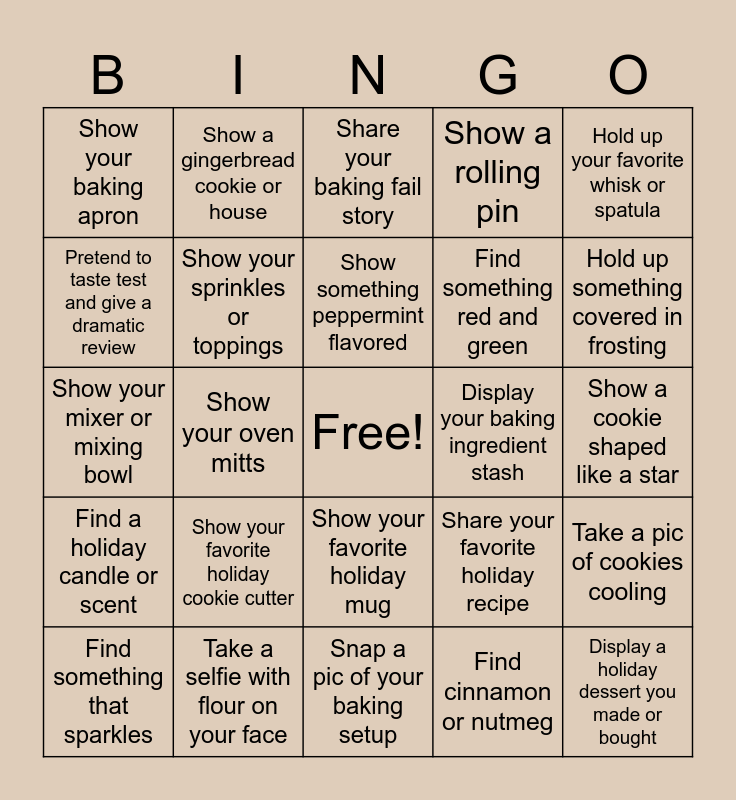 This bingo card has a free space and 24 words: Show your favorite holiday cookie cutter, Take a selfie with flour on your face, Show something peppermint flavored, Find something that sparkles, Hold up your favorite whisk or spatula, Show your baking apron, Pretend to taste test and give a dramatic review, Show a gingerbread cookie or house, Display your baking ingredient stash, Show your favorite holiday mug, Find something red and green, Show your mixer or mixing bowl, Share your favorite holiday recipe, Take a pic of cookies cooling, Show your sprinkles or toppings, Find cinnamon or nutmeg, Show a cookie shaped like a star, Share your baking fail story, Hold up something covered in frosting, Show your oven mitts, Display a holiday dessert you made or bought, Find a holiday candle or scent, Show a rolling pin and Snap a pic of your baking setup.