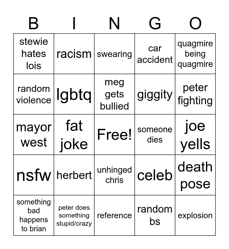 This bingo card has a free space and 24 words: herbert, peter does something stupid/crazy, meg gets bullied, something bad happens to brian, quagmire being quagmire, stewie hates lois, random violence, racism, someone dies, unhinged chris, giggity, mayor west, celeb, death pose, lgbtq, random bs, joe yells, swearing, peter fighting, fat joke, explosion, nsfw, car accident and reference.
