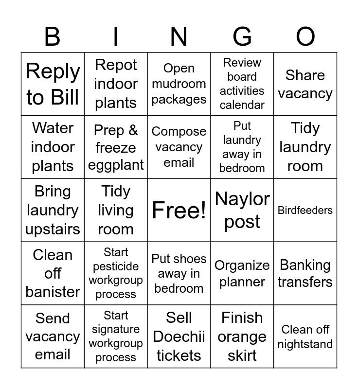 This bingo card has a free space and 24 words: Start pesticide workgroup process, Start signature workgroup process, Compose vacancy email, Send vacancy email, Share vacancy, Reply to Bill, Water indoor plants, Repot indoor plants, Naylor post, Put shoes away in bedroom, Put laundry away in bedroom, Bring laundry upstairs, Organize planner, Banking transfers, Prep & freeze eggplant, Finish orange skirt, Birdfeeders, Open mudroom packages, Tidy laundry room, Tidy living room, Clean off nightstand, Clean off banister, Review board activities calendar and Sell Doechii tickets.