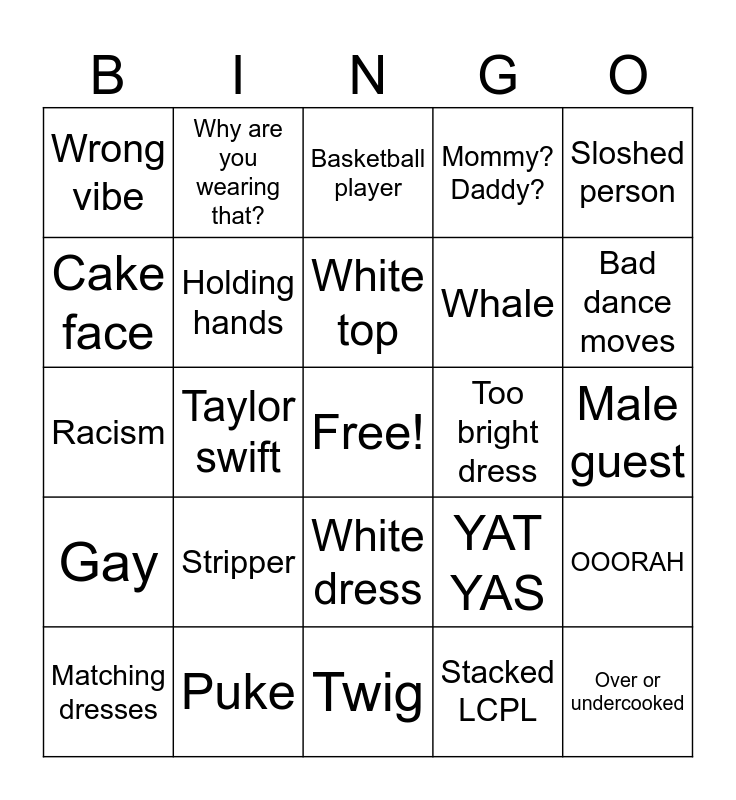 This bingo card has a free space and 24 words: Stripper, Puke, White top, Matching dresses, Sloshed person, Wrong vibe, Cake face, Why are you wearing that?, Too bright dress, White dress, Whale, Racism, YAT YAS, OOORAH, Holding hands, Stacked LCPL, Male guest, Basketball player, Bad dance moves, Taylor swift, Over or undercooked, Gay, Mommy? Daddy? and Twig.