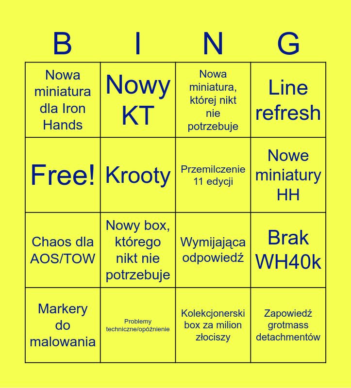 This bingo card has 16 words: Problemy techniczne/opóźnienie, Brak WH40k, Nowa miniatura, której nikt nie potrzebuje, Nowa miniatura dla Iron Hands, Chaos dla AOS/TOW, Nowy KT, Wymijająca odpowiedź, Kolekcjonerski box za milion złociszy, Free!, Krooty, Markery do malowania, Line refresh, Nowy box, którego nikt nie potrzebuje, Nowe miniatury HH, Przemilczenie 11 edycji and Zapowiedź grotmass detachmentów.