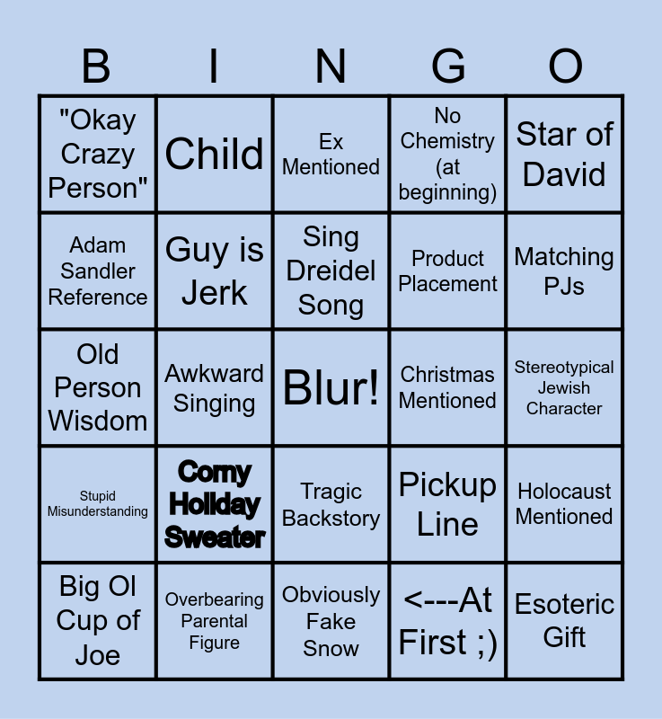 This bingo card has a free space and 24 words: Corny Holiday Sweater, Overbearing Parental Figure, Sing Dreidel Song, Big Ol Cup of Joe, Star of David, "Okay Crazy Person", Adam Sandler Reference, Child, Christmas Mentioned, Tragic Backstory, Product Placement, Old Person Wisdom, Pickup Line, Holocaust Mentioned, Guy is Jerk, <---At First ;), Stereotypical Jewish Character, Ex Mentioned, Matching PJs, Awkward Singing, Esoteric Gift, Stupid Misunderstanding, No Chemistry (at beginning) and Obviously Fake Snow.
