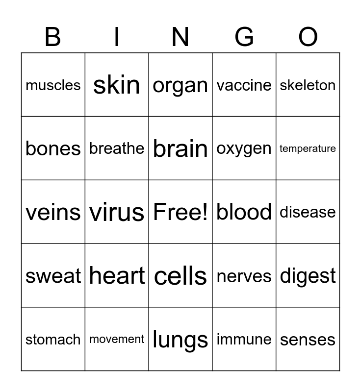 This bingo card has a free space and 25 words: heart, lungs, brain, stomach, skeleton, muscles, bones, skin, blood, cells, oxygen, veins, nerves, digest, breathe, energy, disease, organ, temperature, virus, senses, movement, sweat, vaccine and immune.