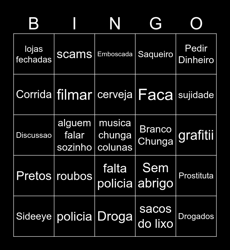 This bingo card has 27 words: Sem abrigo, Drogados, Faca, Droga, Corrida, Emboscada, scams, Pretos, Branco Chunga, Prostituta, Discussao, Saqueiro, Sideeye, policia, sujidade, Agressividade, filmar, cerveja, roubos, lojas fechadas, grafitii, sacos do lixo, alguem falar sozinho, musica chunga colunas, falta policia, Pedir Dinheiro and Indianos.