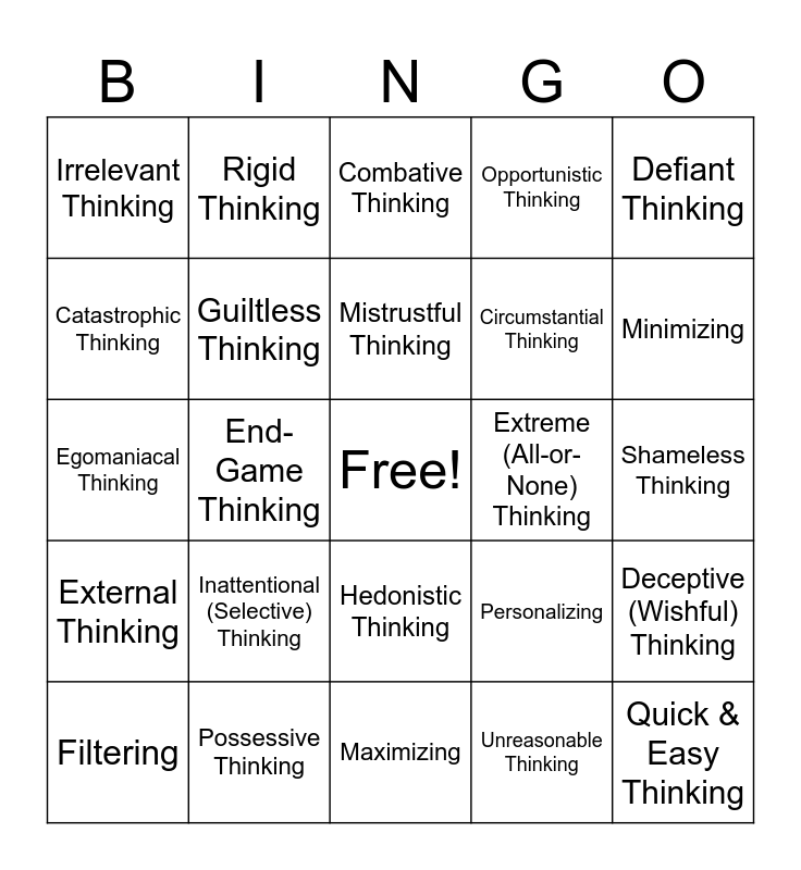 This bingo card has a free space and 40 words: Egocentric Thinking, Egomaniacal Thinking, Prideful Thinking, Guiltless Thinking, Possessive Thinking, Hedonistic Thinking, Mistrustful Thinking, Hard-Luck Thinking, Defiant Thinking, External Thinking, End-Game Thinking, Opportunistic Thinking, Quick & Easy Thinking, Shameless Thinking, Extreme (All-or-None) Thinking, Inattentional (Selective) Thinking, Undaunted Thinking, Irrelevant Thinking, Impulsive Thinking, Combative Thinking, Deceptive (Wishful) Thinking, Unreasonable Thinking, Circumstantial Thinking, Catastrophic Thinking, Magical Thinking, Entitled Thinking, Blaming Thinking, Overgeneralizing, Mind Reading, Fortune Telling, Emotional Reasoning, Filtering, Labeling, Personalizing, Minimizing, Maximizing, Justifying, Avoidant Thinking, Rigid Thinking and Passive Thinking.