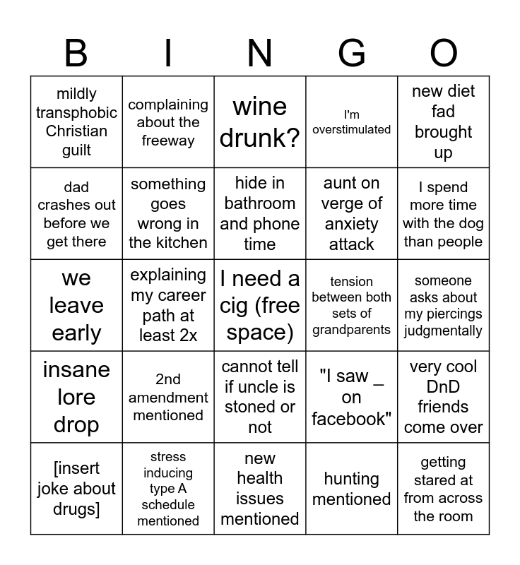 This bingo card has a free space and 24 words: 2nd amendment mentioned, stress inducing type A schedule mentioned, hide in bathroom and phone time, [insert joke about drugs], new diet fad brought up, mildly transphobic Christian guilt, dad crashes out before we get there, complaining about the freeway, tension between both sets of grandparents, cannot tell if uncle is stoned or not, aunt on verge of anxiety attack, we leave early, "I saw _ on facebook", very cool DnD friends come over, something goes wrong in the kitchen, hunting mentioned, someone asks about my piercings judgmentally, wine drunk?, I spend more time with the dog than people, explaining my career path at least 2x, getting stared at from across the room, insane lore drop, I'm overstimulated and new health issues mentioned.