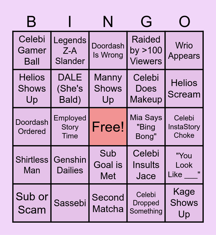 This bingo card has a free space and 29 words: Bug or No Bug, Sassebi, Doordash Is Wrong, Phone Percent >70%, Wrio Appears, Celebi Gamer Ball, DALE (She's Bald), Manny Shows Up, Mia Says "Bing Bong", "You Look Like ___", Sub or Scam, Employed Story Time, Celebi Dropped Something, Kage Shows Up, Doordash Ordered, Celebi's Hair is Wet, Second Matcha, Celebi Insults Jace, Helios Scream, Shirtless Man, Genshin Dailies, Celebi Timed Someone Out, Celebi Does Makeup, Celebi InstaStory Choke, Helios Shows Up, Legends Z-A Slander, Sub Goal is Met, Raided by >100 Viewers and ONE PIECE !?.