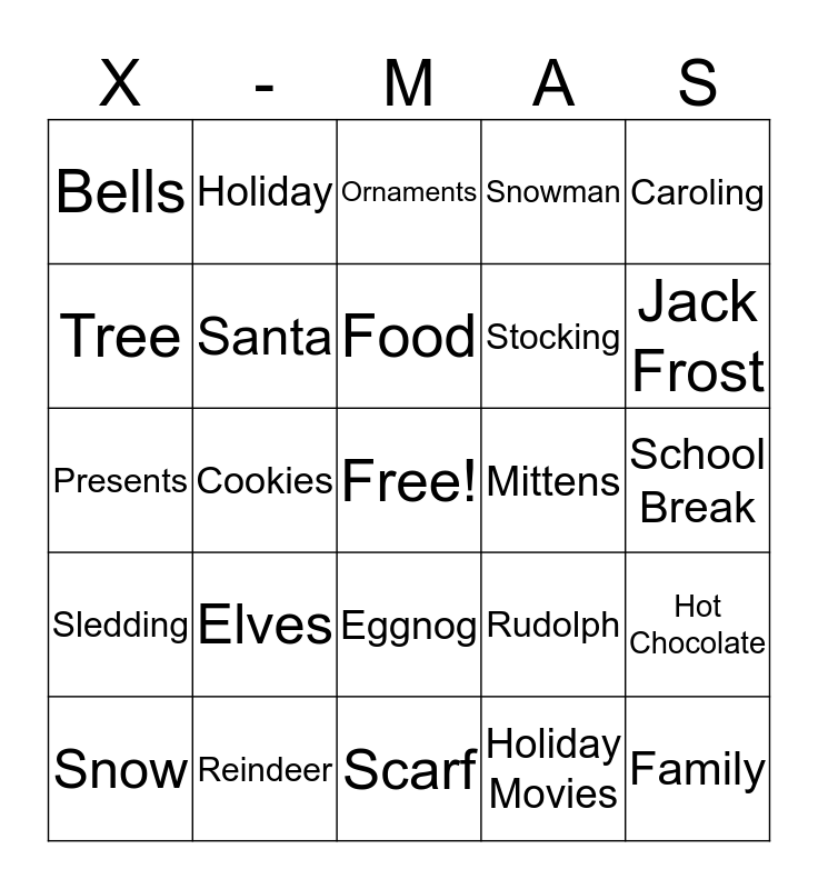 This bingo card has a free space and 24 words: Elves, Reindeer, Food, Snow, Caroling, Bells, Tree, Holiday, Mittens, Eggnog, Stocking, Presents, Rudolph, Hot Chocolate, Santa, Holiday Movies, School Break, Ornaments, Jack Frost, Cookies, Family, Sledding, Snowman and Scarf.