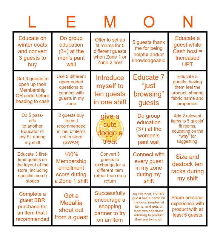 This bingo card has a free space and 24 words: 100% Membership enrollment score during a Zone 1 shift, Get a Medallia shout out from a guest, Introduce myself to ten guests in one shift, Complete a guest BBR purchase for an item that I recommended, Educate a guest while Cash host = Increased UPT, Educate on winter coats and convert 3 guests to buy, Get 3 guests to open up their Membership QR code before heading to cash, Do group education (3+) at the men’s pant wall, Do group education (3+) at the women’s pant wall, Convert 5 guests to exchange for a different item rather than do a return, Educate 7 “just browsing” guests, Do 5 pass-offs to another Educator or my FL during my shift, Connect with every guest in my zone during my shift, Size and destock ten racks during my shift, Use 5 different open-ended questions to connect with guests in my zone, As Fits host, EVERY guest has a name on the door, number of items, and gets at least two check-ins referring to product they are trying on, Add 2 relevant items to 5 guests’ fit rooms, educating on the “why” for suggesting., Offer to set up fit rooms for 5 different guests when Zone 1 or Zone 2 host, Educate 5 guests, having them feel the product, sharing fabric name and properties, 2 guests buy items I recommended in lieu of items not in store (SWAN), Share personal experience with product with at least 5 guests, Educate 3 first-time guests on the layout of the store, including specific merch stories, 5 guests thank me for being helpful and/or knowledgeable and Successfully encourage a shopping partner to try on an item.