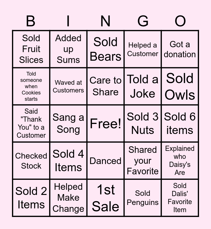 This bingo card has a free space and 24 words: Sold 2 Items, Sold 4 Items, Care to Share, Sold Penguins, Got a donation, Sold Fruit Slices, Added up Sums, Sold Bears, Sold 3 Nuts, Sold 6 items, Said "Thank You" to a Customer, Waved at Customers, Shared your Favorite, Explained who Daisy's Are, Told someone when Cookies starts, Helped Make Change, 1st Sale, Helped a Customer, Sold Owls, Checked Stock, Sang a Song, Danced, Told a Joke and Sold Dalis' Favorite Item.
