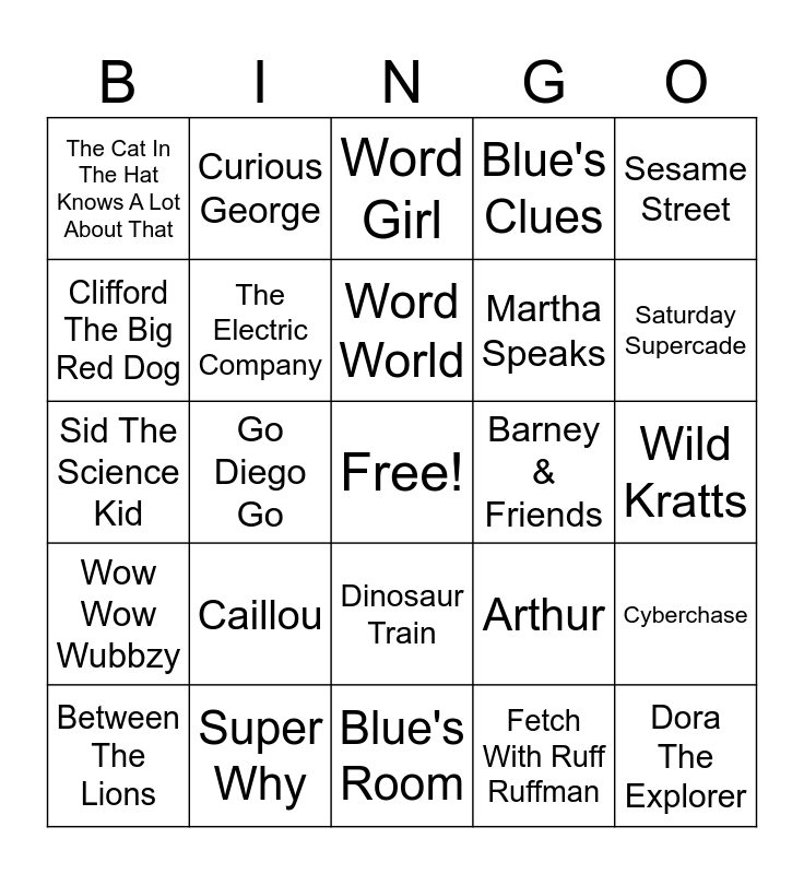 This bingo card has a free space and 24 words: Caillou, Super Why, Word World, Between The Lions, Sesame Street, The Cat In The Hat Knows A Lot About That, Clifford The Big Red Dog, Curious George, Barney & Friends, Dinosaur Train, Martha Speaks, Sid The Science Kid, Arthur, Cyberchase, The Electric Company, Fetch With Ruff Ruffman, Wild Kratts, Word Girl, Saturday Supercade, Go Diego Go, Dora The Explorer, Wow Wow Wubbzy, Blue's Clues and Blue's Room.