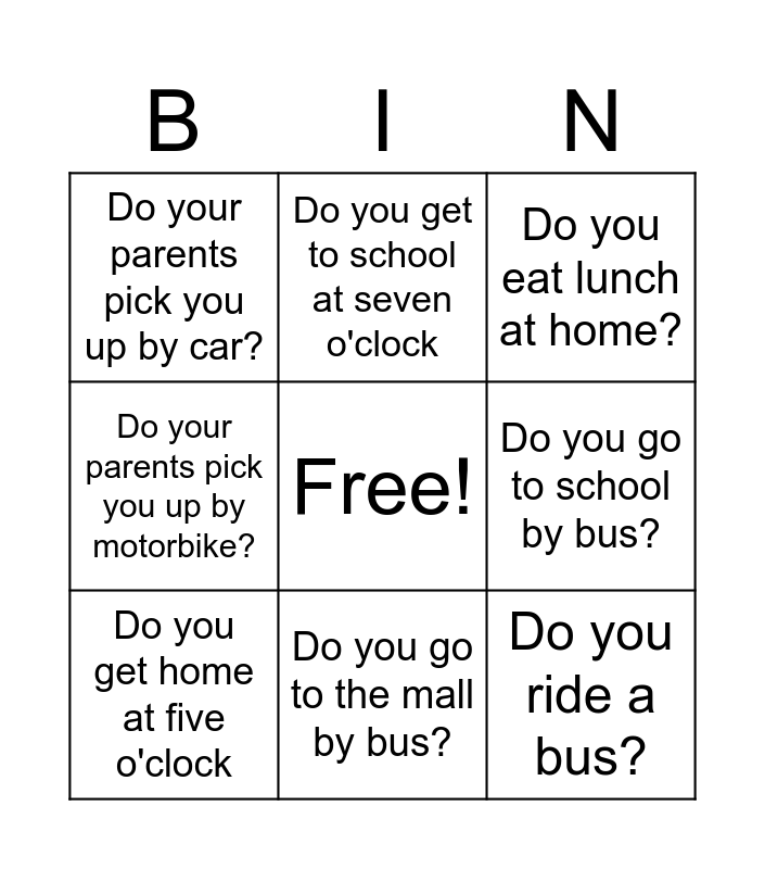 This bingo card has a free space and 8 words: Do you go to school by bus?, Do you eat lunch at home?, Do you get to school at seven o'clock, Do you get home at five o'clock, Do your parents pick you up by car?, Do you ride a bus?, Do your parents pick you up by motorbike? and Do you go to the mall by bus?.