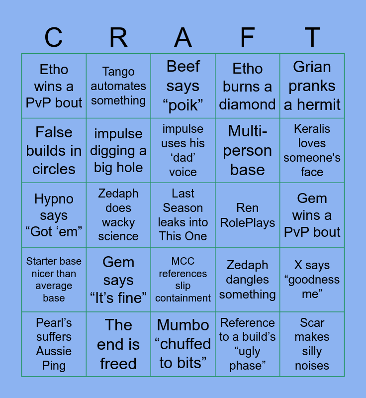 This bingo card has a free space and 80 words: Bdubs finds and bonds with a horse, Bdubs “perfect redstone”, Beef says “poik”, Cleo says “it’s fine”, Cleo says “I appreciate you”, Cleo gets/involved with Revenge, Cub is on the grind, Cub gets up to something sneaky, Doc breaks Minecraft, Doc laughs maniacally, Doc does something wholesome, Etho builds inside out, Etho burns a diamond, Etho wins a PvP bout, Boat Boys interaction or reference, False builds in circles, False wins a PvP bout, Gem says “It’s fine”, Gem says “trust the process”, Gem wins a PvP bout, Grian dooms himself to death, Grian pranks a hermit, Hypno says “Got ‘em”, impulse uses his ‘dad’ voice, impulse digging a big hole, Jevin speedruns something, Jevin says “Got ‘em”, Joe at the spawn with tools, Joel insults his viewers, Joel wins a PvP bout, Keralis loves someone's face, Mumbo uses concept art as a hook, Mumbo “chuffed to bits”, Pearl at 5am, Pearl’s suffers Aussie Ping, Ren RolePlays, Ren tells a story, Death Loop, Scar monologues about Star Wars, Scar makes silly noises, Skizz has good advice, Skizz makes silly noises, Skizz offers a hug, Tango mentions game development, Tango says "Skadoodle", Tango automates something, xB says “Noice!”, xB gets a dog, X offers a new perspective, X has a derp, X says “goodness me”, Zedaph does wacky science, Zedaph dangles something, AFK hermit pranked, find/raid a trial chamber, inappropriate joke, interaction with a new mechanic, Jukebox and music disc Gifted/Shared, Last Season leaks into This One, MCC references slip containment, Multi-person base, new ‘hook’ mini-game to start the season, new neighbor combo, new skin, Phasmo references slip containment, Prank ‘war’, R.E.P.O. references slip containment, raise a warden to the surface, singing, Speedrun Strats used, Starter base nicer than average base, The end is freed, Underdog wins a PvP bout, Villager breeder & trading Hall, You find a new hermit to watch, Noticing cross-hermit references via chat, Reference to a build’s “ugly phase”, Audible smiles, Helpless laughter and Silly noises of startlement.