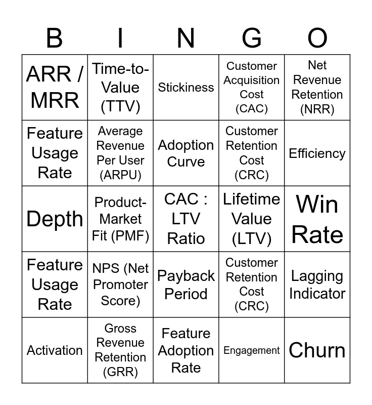 This bingo card has a free space and 44 words: Free!, Churn, Retention, Activation, Adoption, Engagement, Stickiness, Expansion, Net Revenue Retention (NRR), Gross Revenue Retention (GRR), Customer Acquisition Cost (CAC), Lifetime Value (LTV), Payback Period, NPS (Net Promoter Score), CSAT (Customer Satisfaction), Feature Adoption Rate, Breadth, Depth, Frequency, Efficiency, Time-to-Value (TTV), Conversion Rate, Attach Rate, ARR / MRR, Churn Avoidance / Retention Revenue, Win Rate, Average Revenue Per User (ARPU), Product-Market Fit (PMF), Customer Retention Cost (CRC), Feature Usage Rate, Adoption Curve, Lagging Indicator, North Star Metric, Leading Indicator, Product-Market Fit (PMF), North Star Metric, Leading Indicator, Lagging Indicator, Adoption Curve, Feature Usage Rate, Customer Retention Cost (CRC), Gross Margin, Average Revenue Per User (ARPU) and Win Rate.