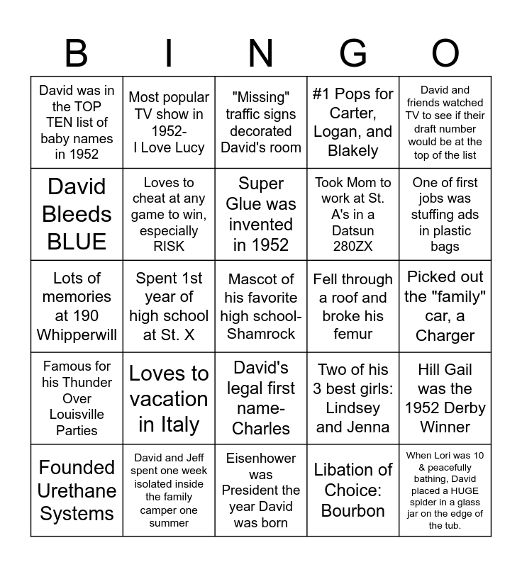 This bingo card has a free space and 29 words: Founded Urethane Systems, Nickname for one of 1st girlfriends was Marshmallow, Spent 1st year of high school at St. X, Mr. Potato Head was the most popular Christmas gift in 1952, David was in the TOP TEN list of baby names in 1952, "Missing" traffic signs decorated David's room, Loves to cheat at any game to win, especially RISK, Loves to vacation in Italy, Fell through a roof and broke his femur, David and Jeff spent one week isolated inside the family camper one summer, Picked out the "family" car, a Charger, When Lori was 10 & peacefully bathing, David placed a HUGE spider in a glass jar on the edge of the tub., Eisenhower was President the year David was born, Libation of Choice: Bourbon, One of first jobs was stuffing ads in plastic bags, Favorite Radio Station-WAKY, David's legal first name-Charles, Famous for his Thunder Over Louisville Parties, David and friends watched TV to see if their draft number would be at the top of the list, Lots of memories at 190 Whipperwill, Two of his 3 best girls: Lindsey and Jenna, In 1980, David made the best decision of his life, Took Mom to work at St. A's in a Datsun 280ZX, David Bleeds BLUE, #1 Pops for Carter, Logan, and Blakely, Most popular TV show in 1952- I Love Lucy, Hill Gail was the 1952 Derby Winner, Super Glue was invented in 1952 and Loves potato chips.