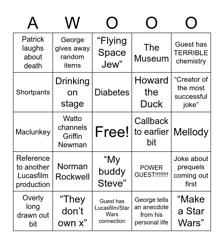 This bingo card has a free space and 45 words: Detours mention, “Make a Star Wars”, Patrick slander, Overly long drawn out bit, Butter Boy/Girl, George tells an anecdote from his personal life, “Flying Space Jew”, Guest has great chemistry, Guest has TERRIBLE chemistry, “They don’t own x”, The Museum, Callback to earlier bit, “My buddy Steve”, Norman Rockwell, Mention of George’s “loss”, Guest has Lucasfilm/Star Wars connection, George smashes something with a hammer, Maclunkey, Surprise guest, “Creator of the most successful joke”, George gives away random items, Butterbear speaks, Watto cup, Patrick laughs about death, Bad pun, Mellody, Priceless, Our Guests chant, POWER GUEST!!!!!!!!, Reference to another Lucasfilm production, Director’s Guild, Joke about prequels coming out first, Sucking face with Linda Ronstadt, Stained glass, Drinking on stage/stream, Watto channels Griffin Newman, Rough cut/test screening, Technical difficulty, Breaking into song, Diabetes, Shortpants, Howard the Duck, Patrick forgets to bring something, Drinking on stage and Eating on stage.