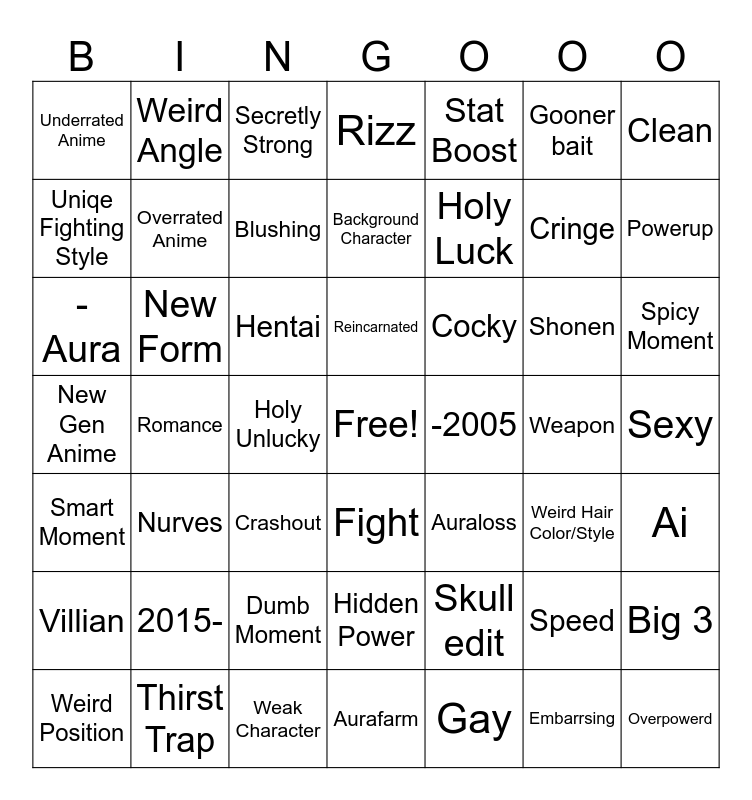 This bingo card has a free space and 48 words: Skull edit, Cringe, Aurafarm, Romance, Hentai, Sexy, Weird Angle, Thirst Trap, Gooner bait, Fight, Clean, Rizz, Shonen, Cocky, Villian, Weapon, Uniqe Fighting Style, Powerup, Speed, Stat Boost, Holy Luck, Holy Unlucky, Underrated Anime, Overrated Anime, Big 3, Blushing, Spicy Moment, Weird Position, Reincarnated, New Form, Embarrsing, -2005, Ai, 2015-, New Gen Anime, Auraloss, Weird Hair Color/Style, - Aura, Crashout, Dumb Moment, Smart Moment, Overpowerd, Secretly Strong, Weak Character, Background Character, Hidden Power, Nurves and Gay.